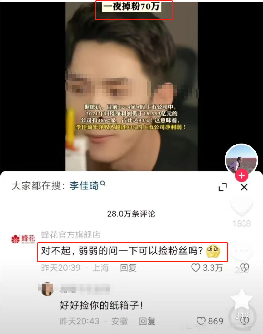 李佳琦一夜掉粉几百万,蜂花直接跑到李佳琦掉粉视频评论区喊话,一上来就问:可以捡粉吗?