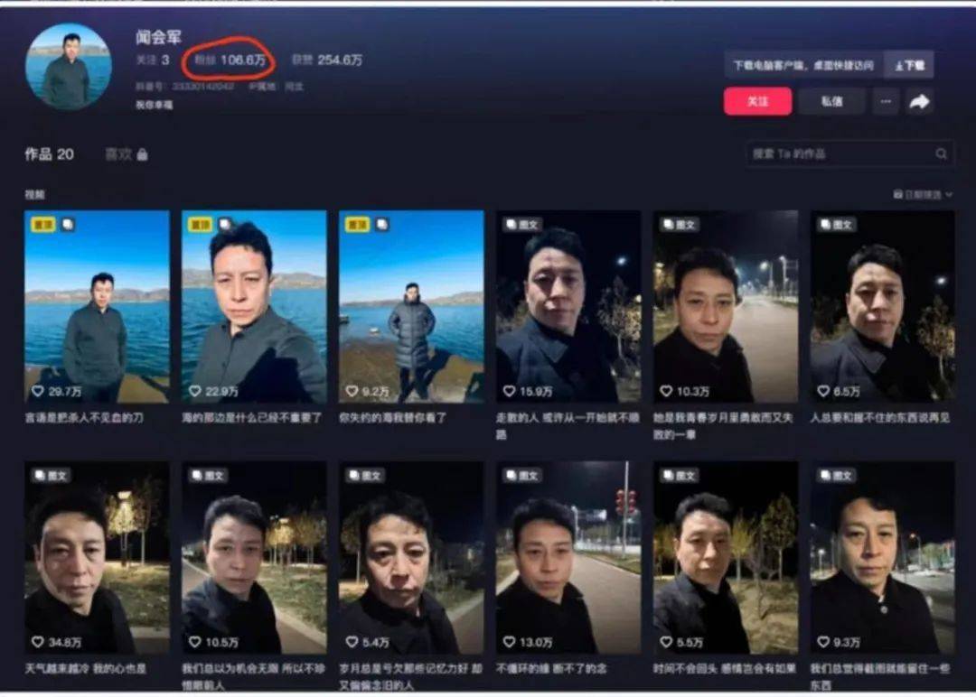 查询之下,大家发现这些内容的来源是一个抖音名为“闻会军”的账号。在这里,闻会军主打的就是一个深情,几乎所有内容就是自拍照片加文字,以及他深沉的表情,颇有一点之前深受中老年人喜欢的主播“秀才”的味道。