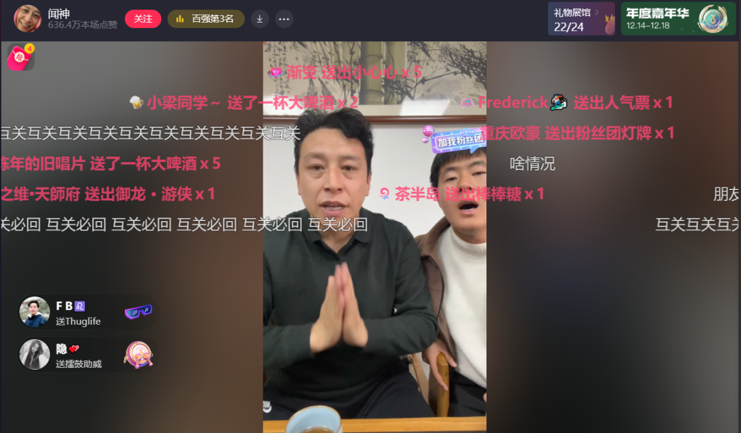 到了晚上场,闻会军的直播更是热闹无比,面对眼花缭乱的弹幕,闻会军只能一边跟随音乐扭动上身, 一边双手合十,冲着屏幕作揖:“感谢大佬的礼物,感谢感谢!”一些主播也为了“占位”蹭流量,疯狂给闻会军刷礼物。