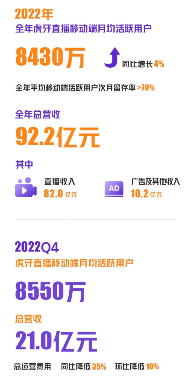 用户数据方面,全年虎牙直播移动端MAU(月均活跃用户数)达8430万,同比增长4.2%。2022年第四季度,虎牙公司总收入为21.02亿元,该季度,虎牙直播移动端MAU达8550万。