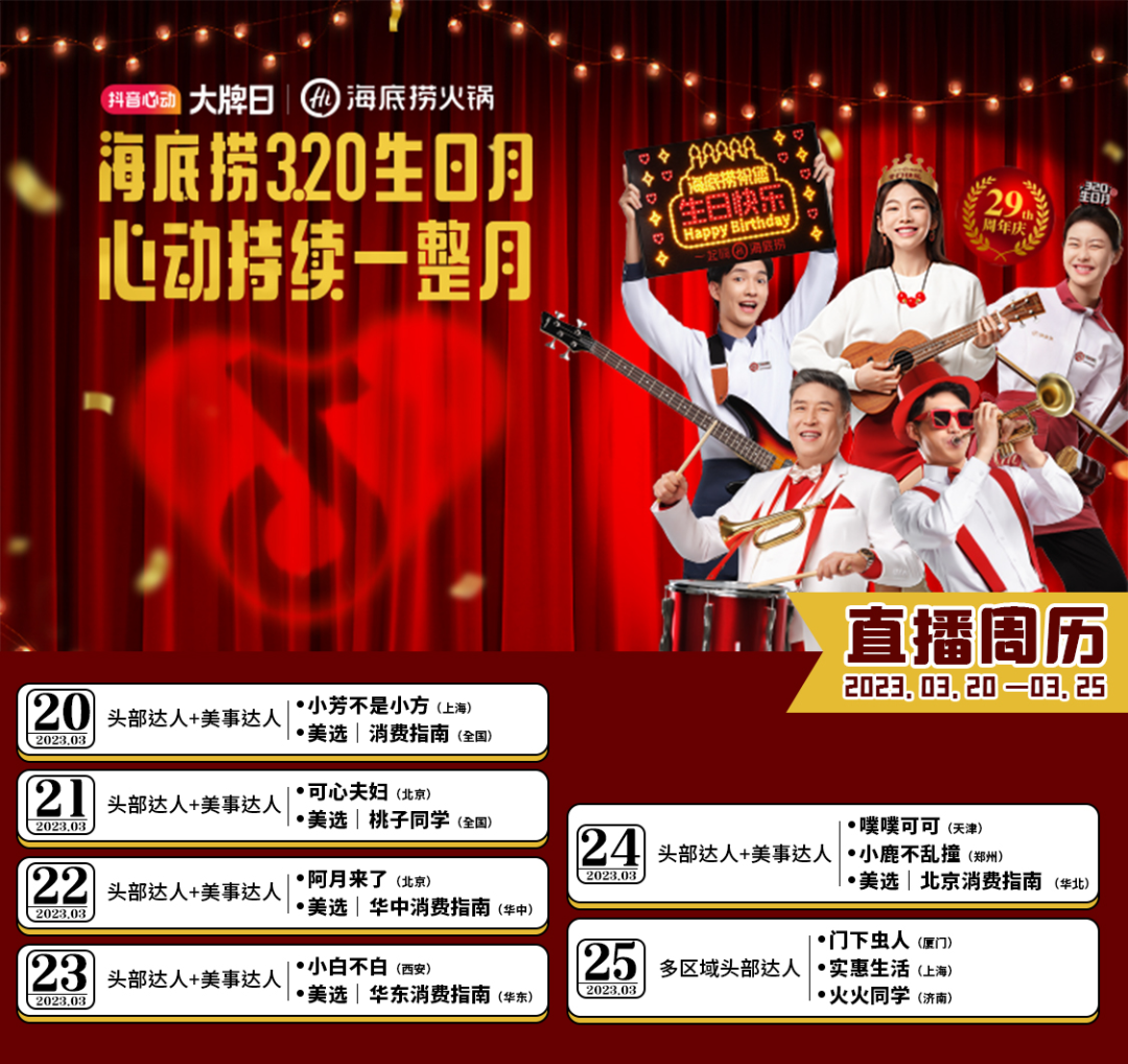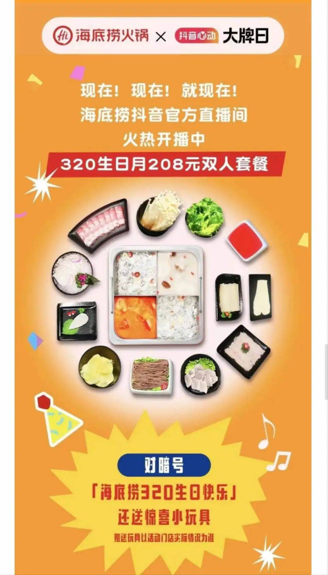 比如,上个月中旬举行的“320 生日嘉年华”,海底捞铆足干劲做营销:一边策划连续近一周的大型直播活动,一边推动短视频内容营销,让生日活动出圈。甚至还把脱口秀“顶流”演员何广智请到直播间讲脱口秀,同时又邀请了大量中腰部主播做专场直播带货。