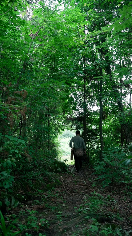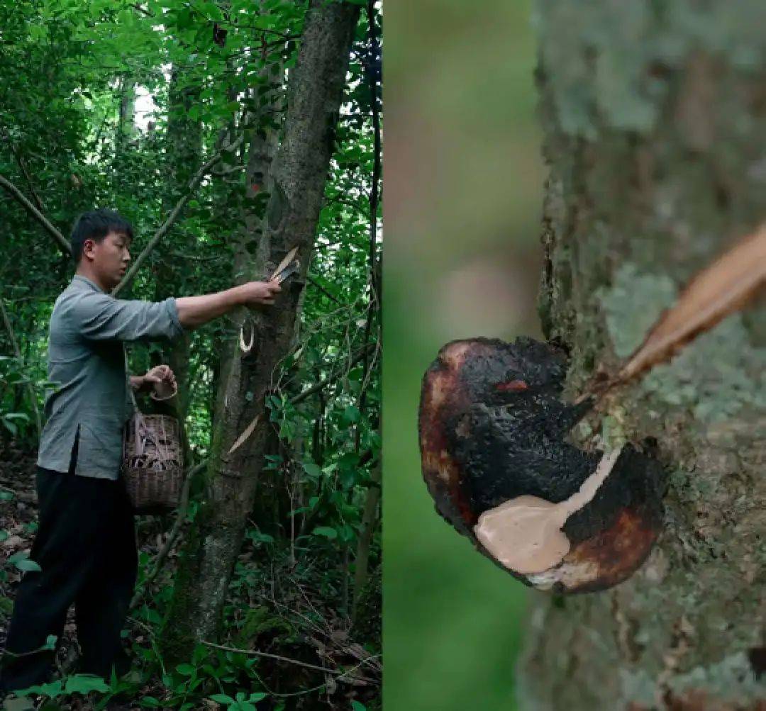 视频一开场,就是正在割漆的“山白”。伴着鸟鸣、虫鸣,“山白”熟练地在几棵环抱粗的漆树上划开一道口子,用贝壳接住留出的汁液,再倒到竹筒里,不断重复,直至天色渐暗。