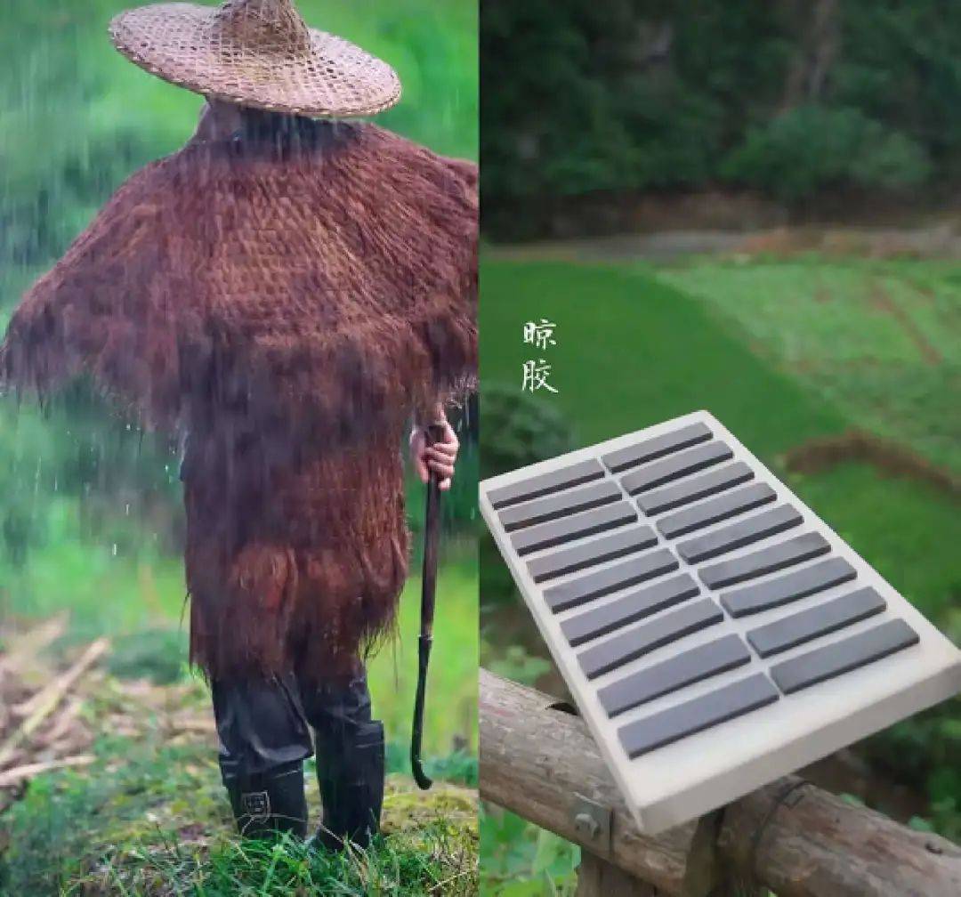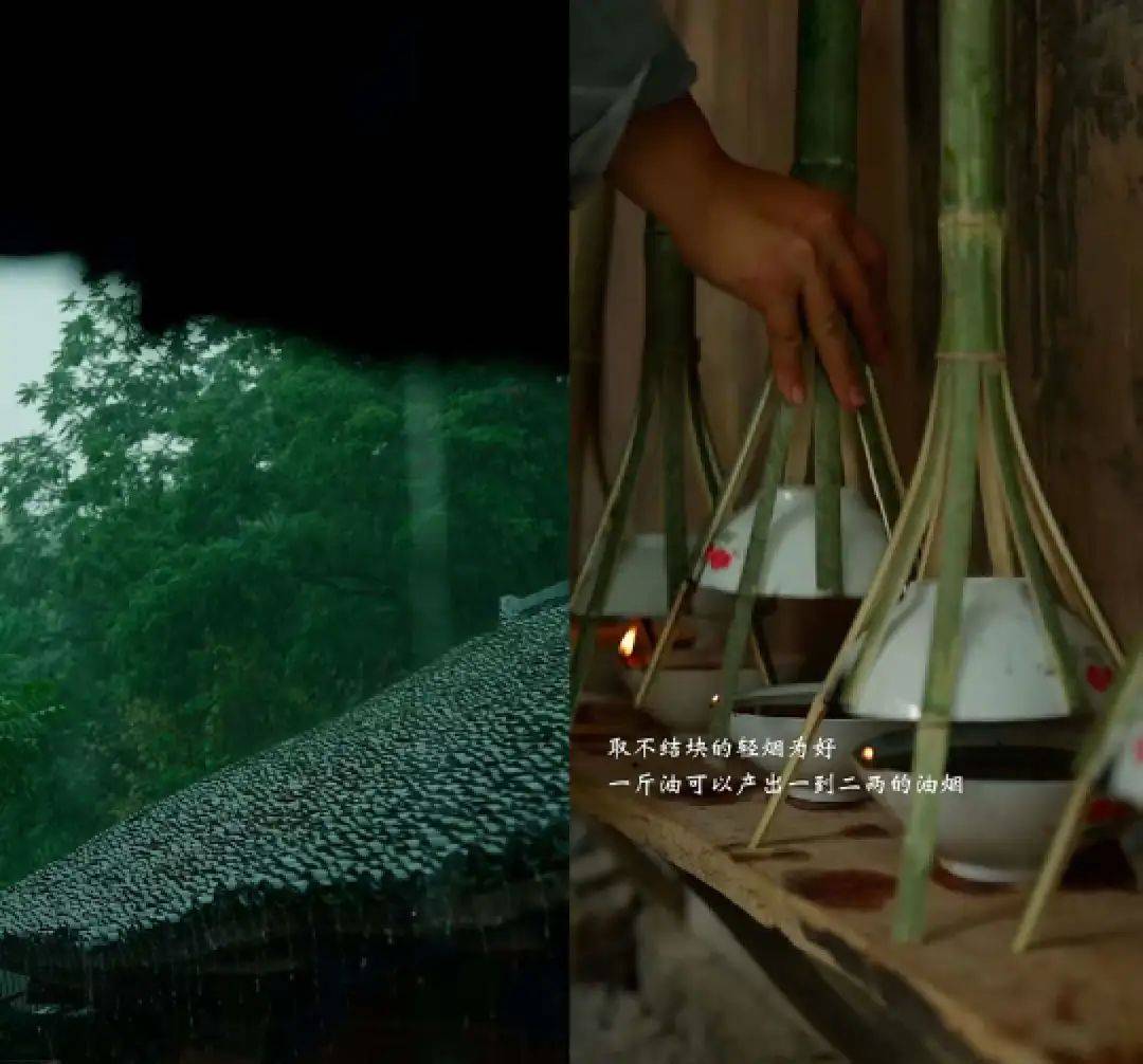 视频中,雨水顺着屋檐淅沥沥地落下,“山白”则用羽毛一个个从碗中扫下收集到的油烟。