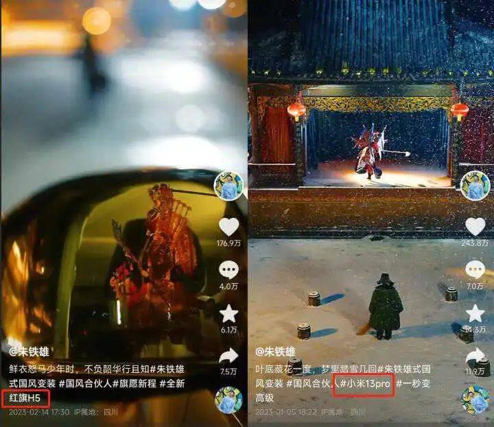 与“山白”等博主复刻中国传统物件、技艺不同,“朱铁雄”选择用变装视频表达中国传统文化中的情感。“朱铁雄”的创作思路是通过京剧、舞狮、甲胄等传统文化元素,展现国风魅力,同时加入勇气、坚持、传承、道义等传统情感,挖掘两代人对传统文化的不同情感。