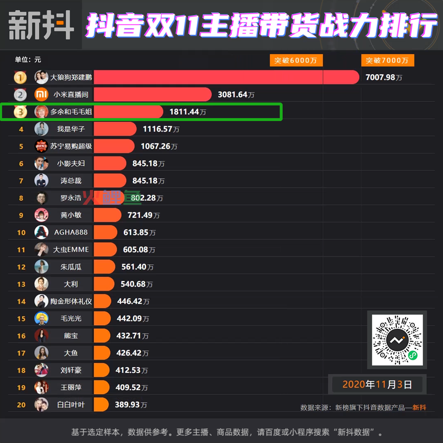 毛毛姐入场直播圈的记录可以追溯到2020年11月3日,当时他以1819万元预估销售额位居当天抖音带货榜第3名。