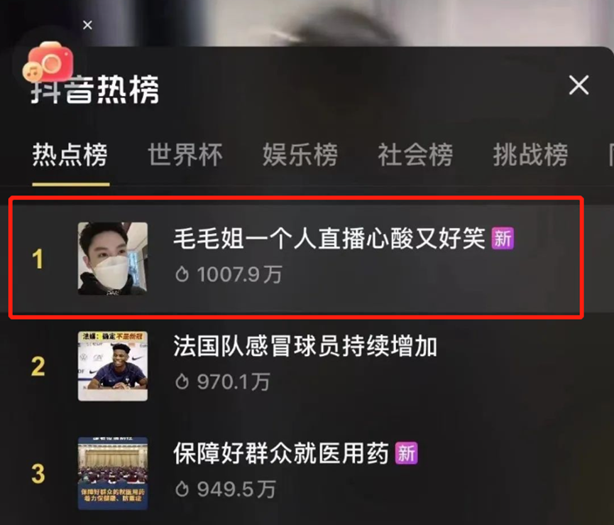 “毛毛姐一个人直播心酸又好笑”的话题随即登上抖音热点榜榜单第一名,话题热度高达1000多万,同时也吸引了更多看客加入这场直播,面对奔涌而来的观众更是惊呆了毛毛姐,直呼“好多人啊”。