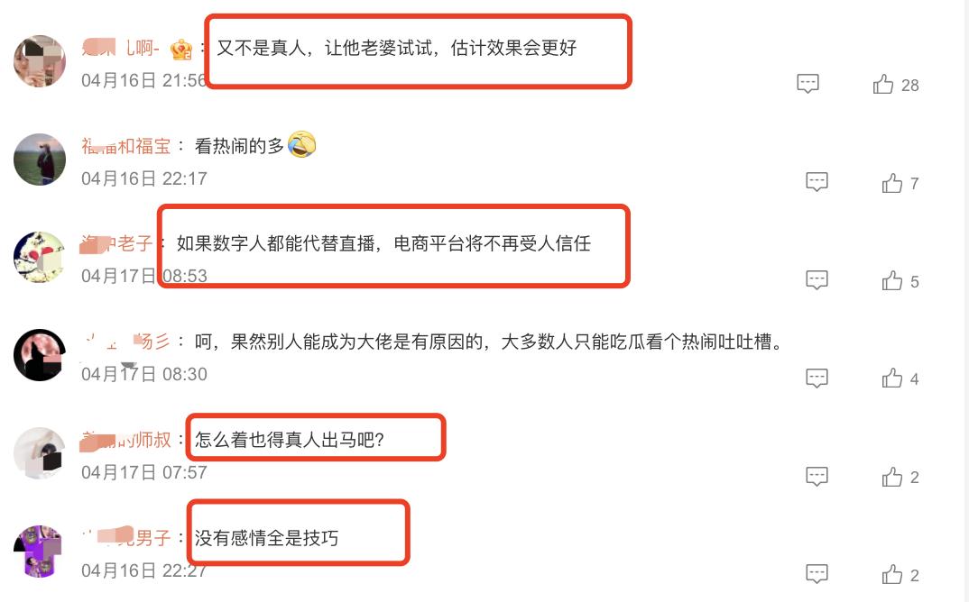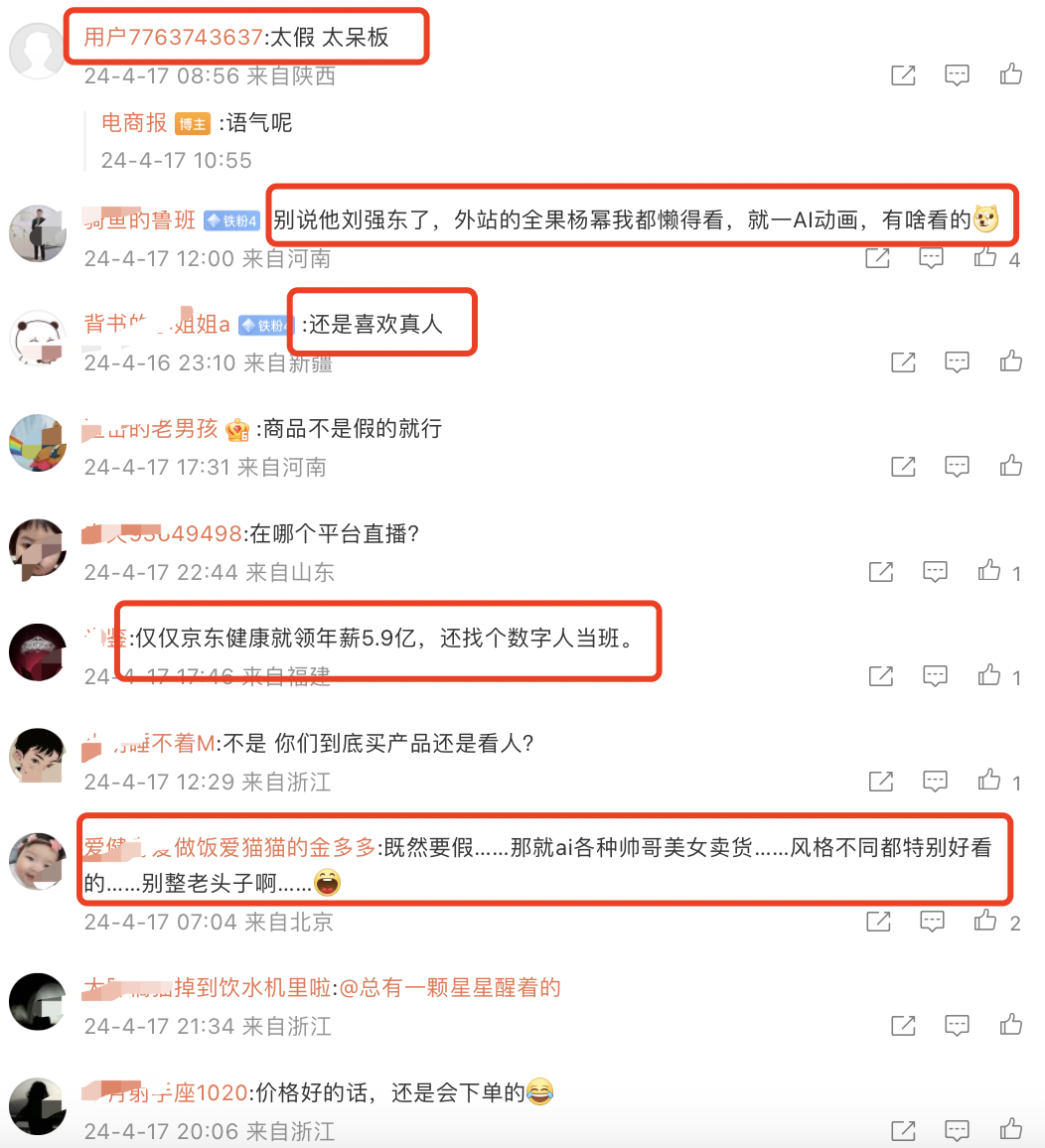 但很显然,这其实是一次失败的直播,因为如果是刘强东真人,效果会数倍于此。从直播间大量吐槽的观众以及事后的网友评论来看,数字人直播,不够真诚,严重影响了转化率,换言之,假如是同样的流量,刘强东真人,转化率至少翻几倍。也就是说——刘强东数字人浪费了太多的流量,5000万GMV中绝大多数的功劳是依靠了”刘强东IP“的加持,同时,这次直播也一定意义上透支了”刘强东IP“。