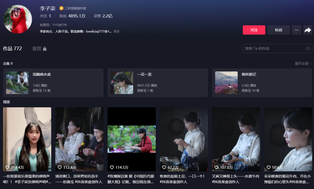李子柒是田园短视频代表人物,她的视频内容主要聚焦于中国传统文化、农村生活和美食制作等方面,以别致的拍摄手法和细腻入微的叙事风格走红网络。在李子柒的短视频中,融合着古风的玄妙之音、自然的BGM,长裙麻衣的服饰美学,在田园中传递着生活的精美以及那个我们熟悉又陌生的乡村。