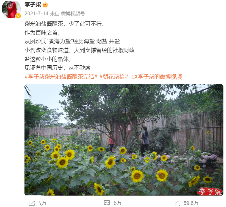 2021年7月14日,在发布了《柴米油盐酱醋茶》系列的完结篇“盐”后,李子柒暂停了视频更新。