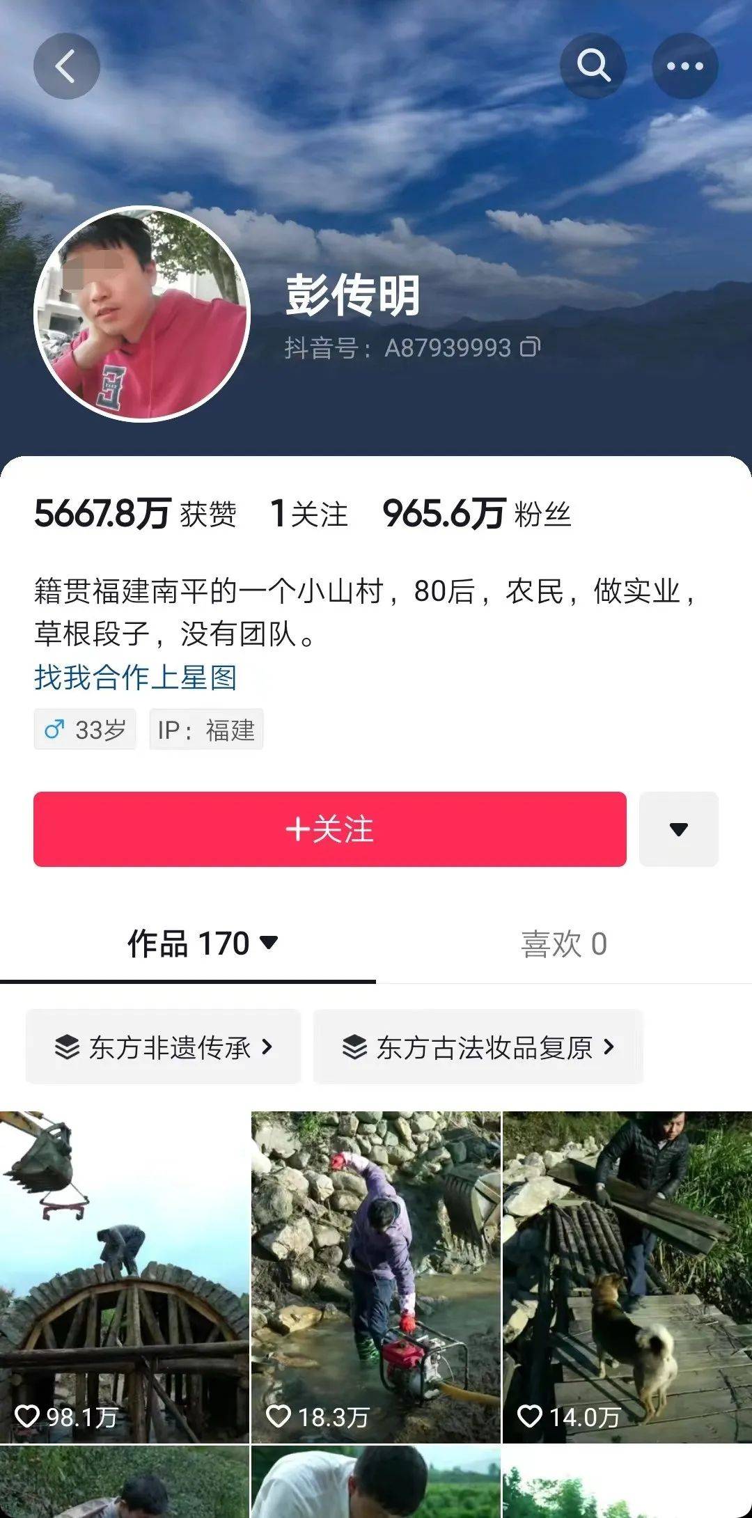 有“男版李子柒”之称的彭传明,就是“田园风”视频上的佼佼者。
