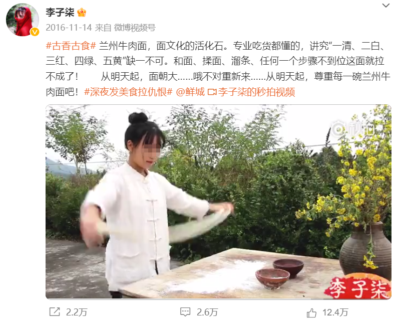 2016年11月,李子柒在微博发布的视频《兰州牛肉面》,全网播放量最终突破了5000万,点赞超过60万,这使她成功出圈。