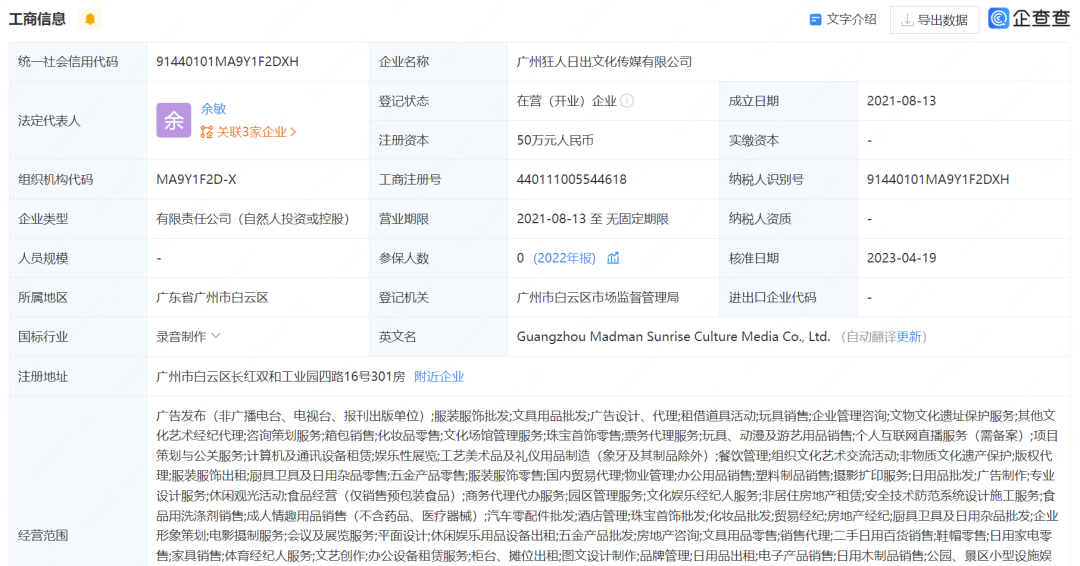 抖音主页显示,账号归属于一个叫“狂人日出”的MCN旗下。企查查显示,这是一家位于广州的MCN机构,2021年成立,目前暂未搜索到这家机构旗下更多达人的信息。