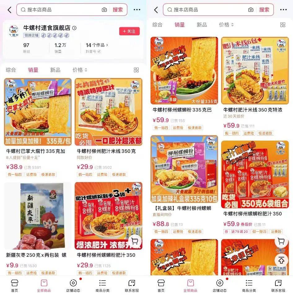 虽说直播带货潜力还有待持续挖掘,但在牛富祥个人账号的宣传吆喝下,以及抖音橱窗的曝光引流,牛螺村螺蛳粉的抖音旗舰店销量已有不错的成绩。
