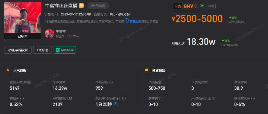 然而从流量转化效率来说,牛富祥直播带货的转化率并不算高,场均转化率0-5%,直播GPM(千次官方成交,观看1000次的情况下有多少成交额)为10-50元。