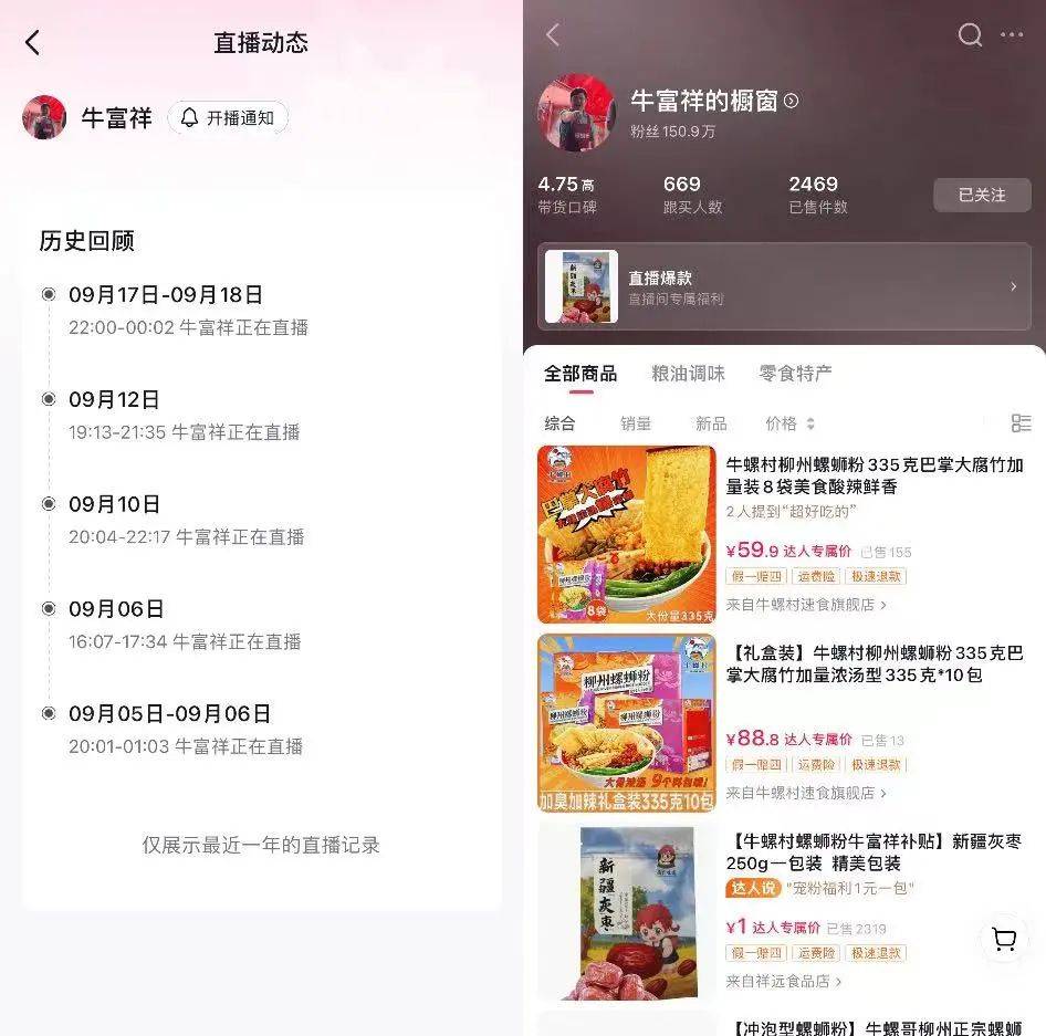 首播之后,他又在接下来一周内做了三次直播,几乎隔两三天直播一次,每次直播的链接基本都是牛螺村螺蛳粉和新疆灰枣。