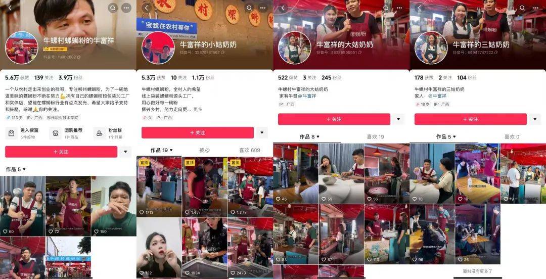 几个出镜的“女儿”也分别开设了自己的抖音账号,叫“牛富祥的大姑奶奶”、“牛富祥的小姑奶奶”、“牛富祥的三姑奶奶”,分享以她们为主角的螺蛳粉摊位故事。