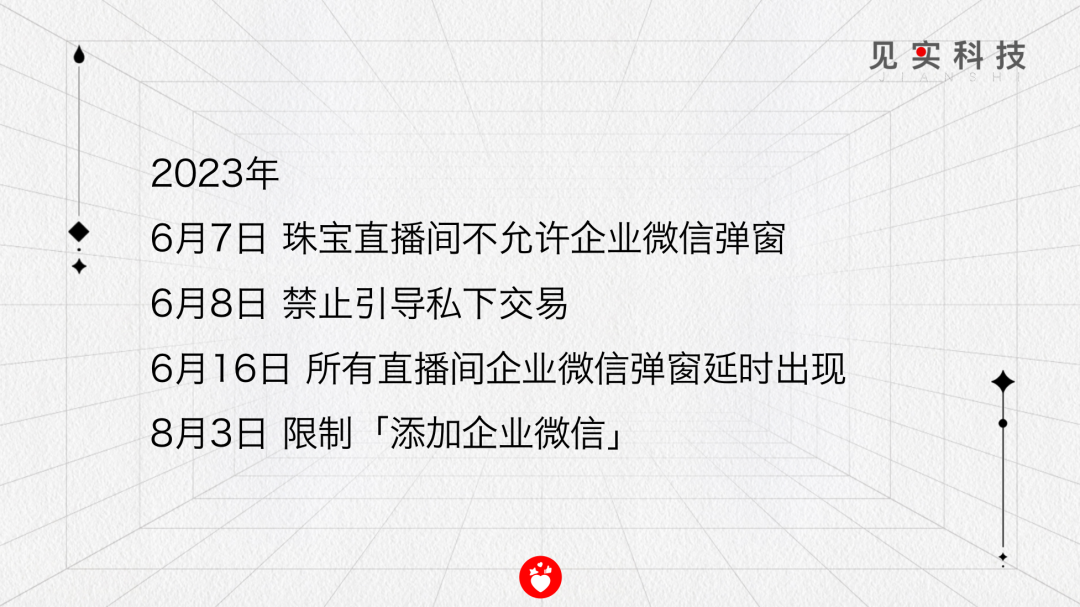 比如在618期间出来了禁止私下引导私下交易的政策;直播间不允许放二维码等政策,被查到即违规;6月中旬的政策是所有直播间企业微信弹窗延时出现,在直播间停留10分钟以上的人才会看到企业微信,在直播间停留时间不长的话,根本就看不到弹出来的二维码;8月初视频号还宣布限制添加企业微信......