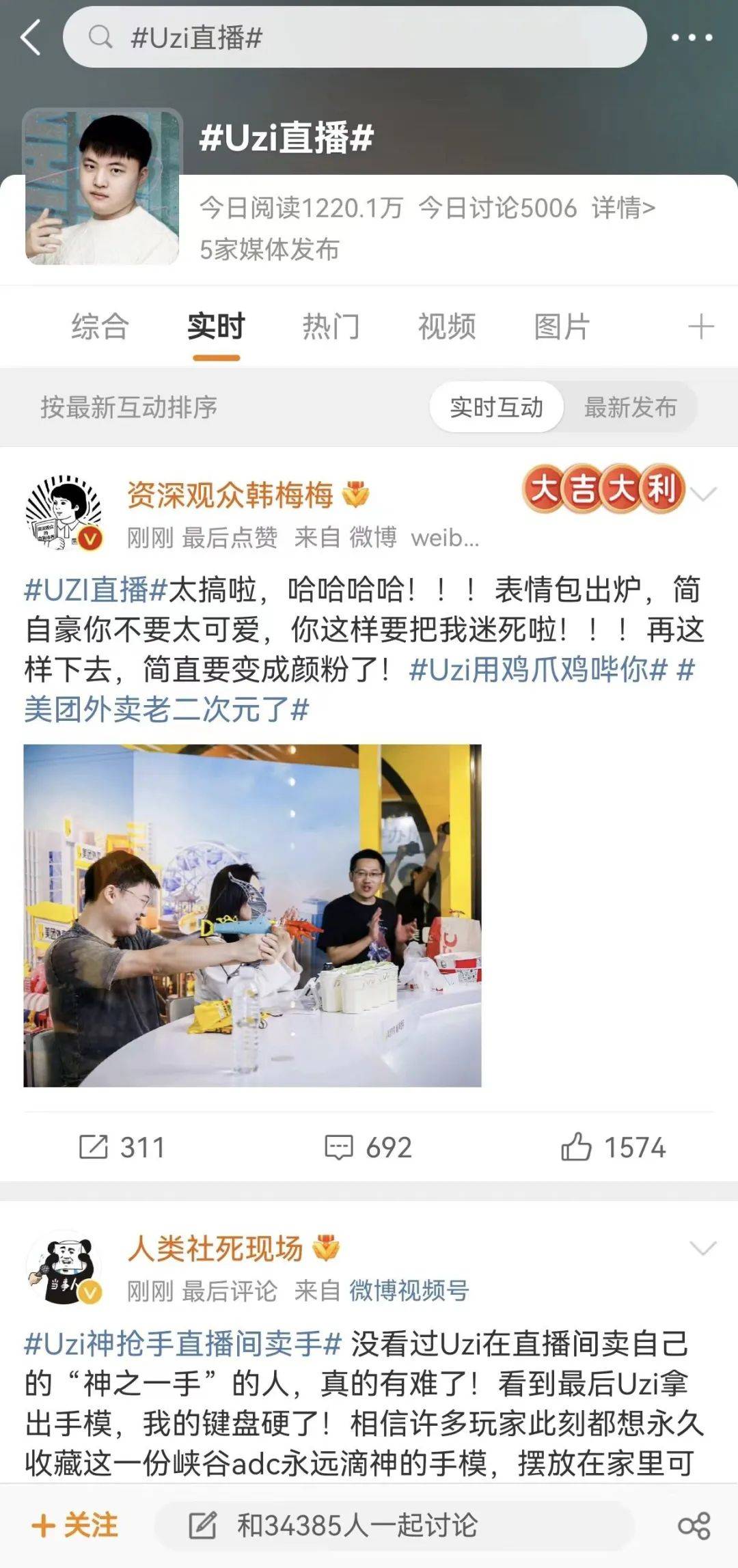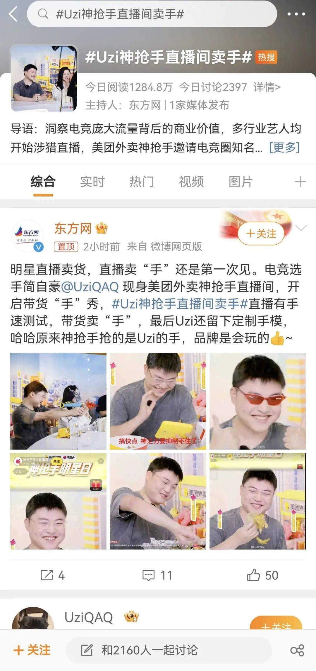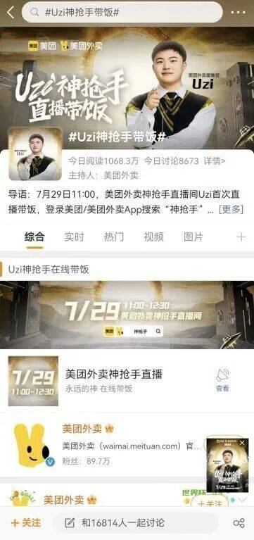 不过今天,兵法先生注意到一场很有意思的直播——美团外卖神抢手携手电竞圈“顶流”UZI亮相直播间,一开播就吸引了无数网友的关注和讨论,短短一个小时就在全网累积了2.4亿的阅读量。此次直播不仅在微博上带火了#Uzi直播#、#Uzi神抢手带饭# 、#Uzi神抢手直播间卖手#等热门话题,#Uzi代言美团外卖#也在直播期间登上了B站,热搜最高排名第2的位置。