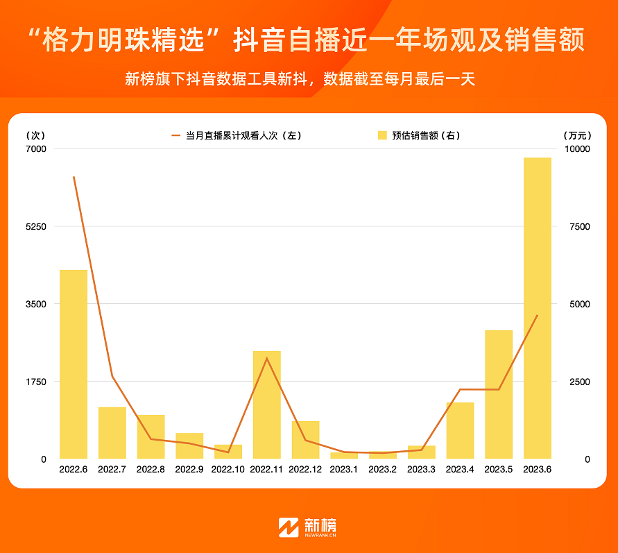 新抖数据显示,去年6月至今年6月,“格力明珠精选”有8个月销售额超过千万元,5个月场观达到千万以上,近一年累计预估GMV达3.1亿元。