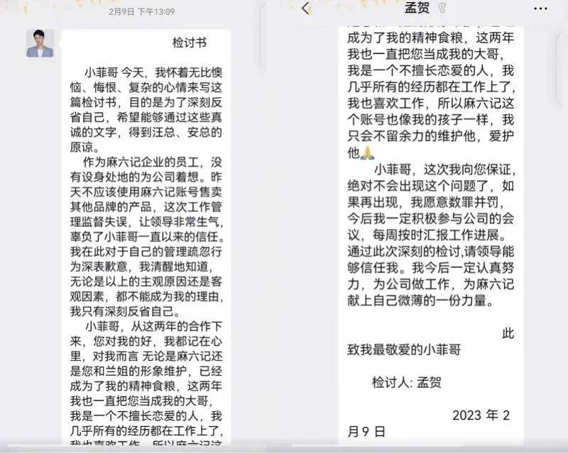 在合作一年多里,麻六记支付孟贺直播运营团队一千多万元佣金。由于孟贺直播运营团队为追求更多直播间个人收益,不遵守合约精神,在麻六记直播间私自售卖其他品牌产品,经过多次警告后继续违约,麻六记还公开了一段来自孟贺的检讨书。