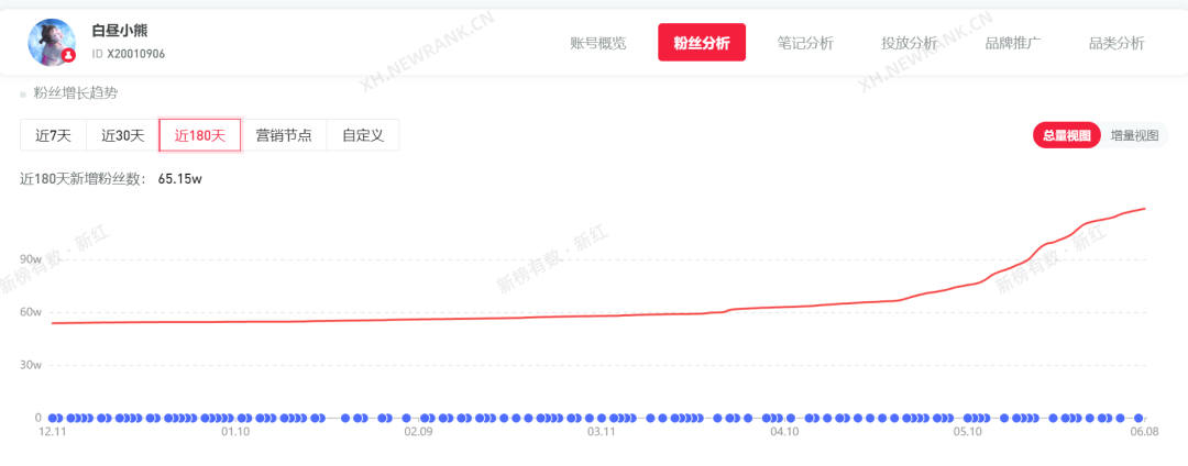 新榜旗下抖音和小红书数据工具显示,“白昼小熊”账号在抖音一个月涨粉250万,小红书单月涨粉50万。