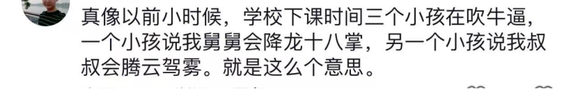 「真像以前小时候,学校下班时间三个小孩子在吹牛,一个小孩说我舅舅会降龙十八掌,另一个小孩说我叔叔会腾云驾雾。就是这个么意思。」