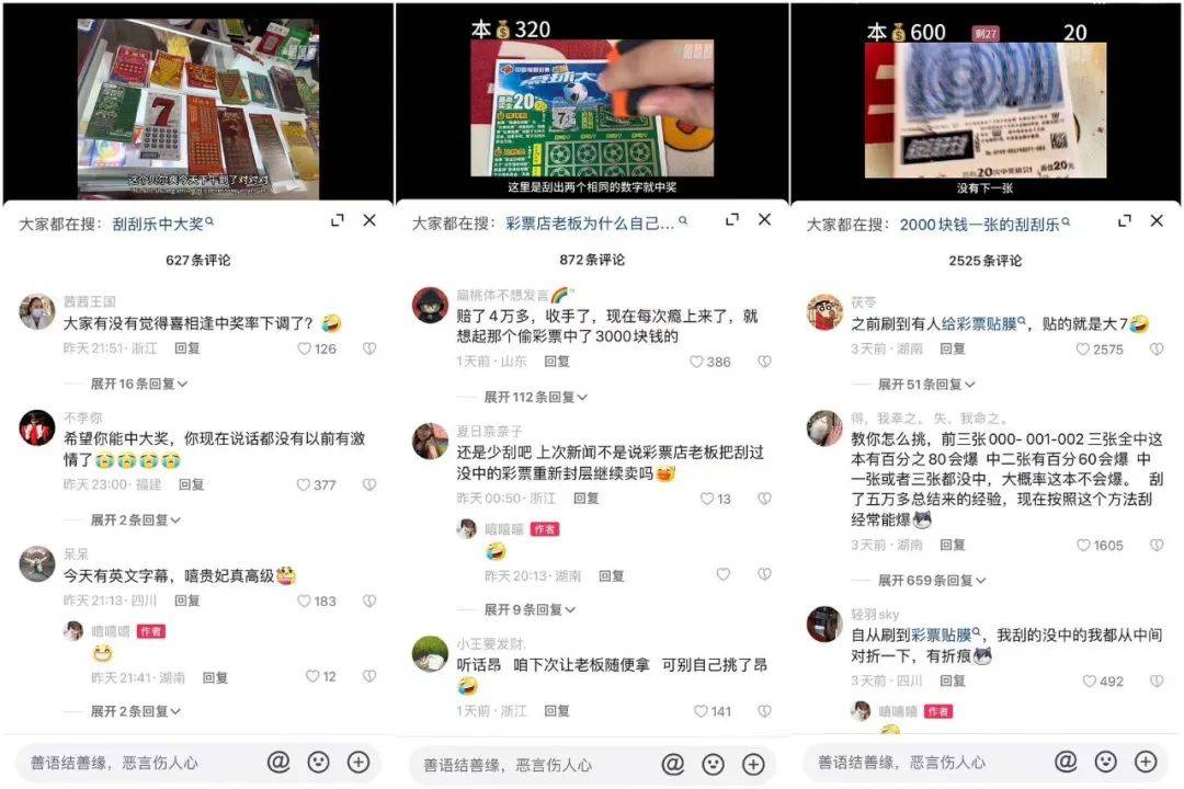 更加值得关注的,是视频下方的“粉丝团建”。众多粉丝围坐一团,分享着自己的刮票心得:什么类型的彩票更容易中奖?博主今天的购票策略有什么问题?还有粉丝留言,想请博主代购自己这边没有的某种刮刮乐。