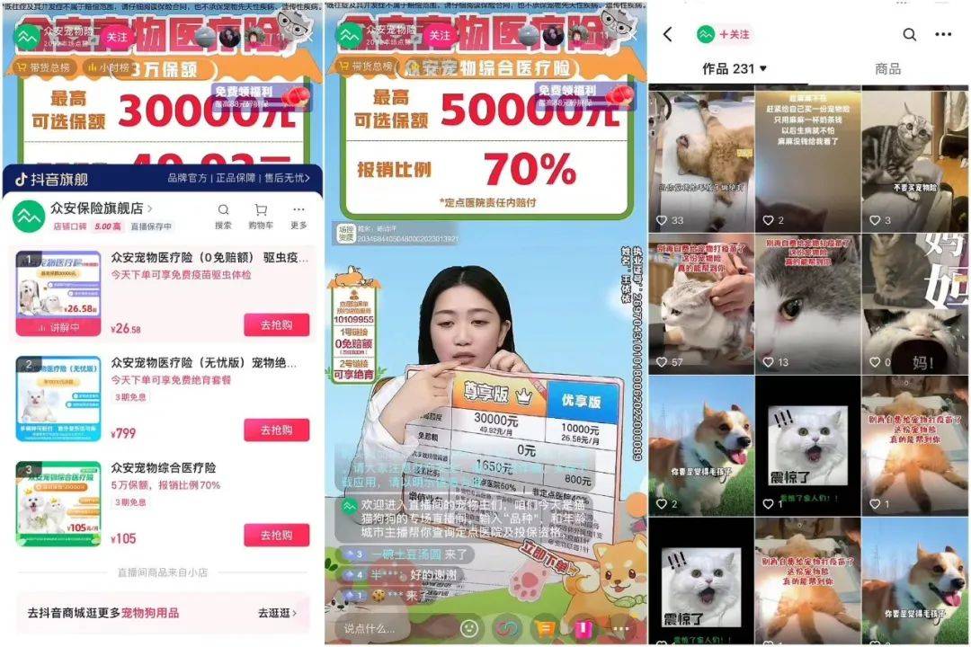 @众安宠物险 的直播间内只有三个产品,主播在镜头前卖力地向大家讲解着三个宠物保险的细节与区别,一项项解释产品包含的服务与优惠,即使直播间内只有10来个人,但数据显示,这样一场直播却能带出2500-5000元的产品。