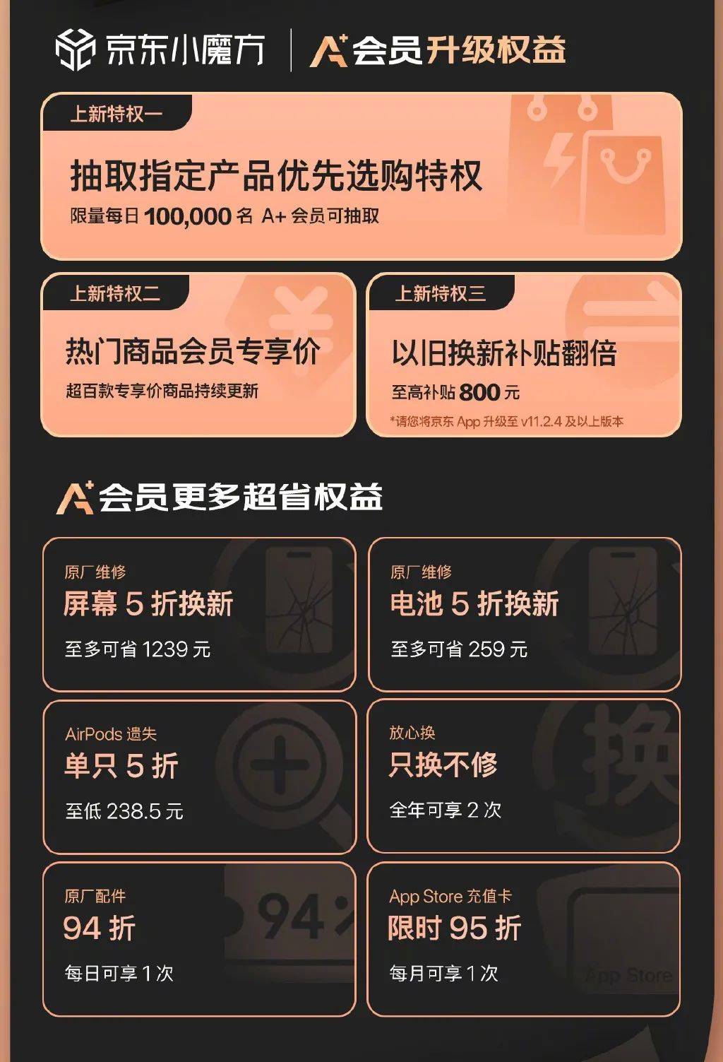 一是在往年的基础上,A+会员还可额外享受618权益,即从下单之日起至6月18日,会员下单苹果产品可享30天内价保权益,买贵即赔;