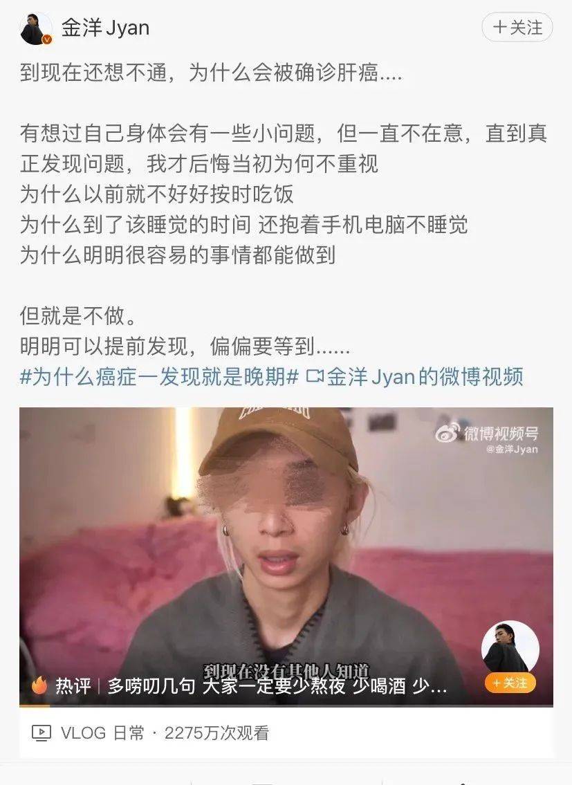一位粉丝数高达550万的顶流网红@金洋Jyan,拍视频《为什么癌症一发现就是晚期》称自己被确诊肝癌晚期,一时间博取了无数人同情,视频总播放量超过2200万。