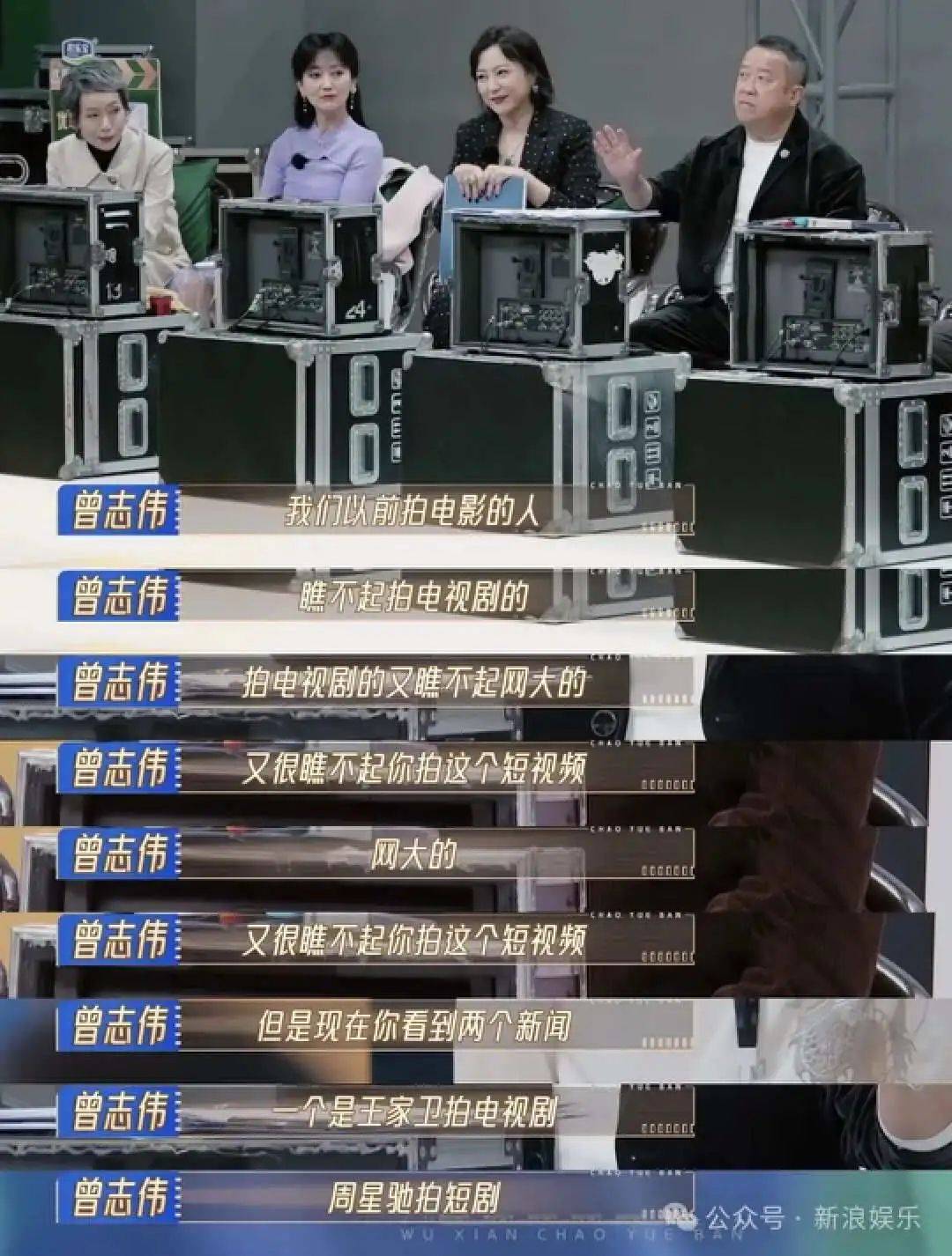 最近,曾志伟在《无限超越班2》中驳斥了所谓的职业鄙视链:“我们以前拍电影的人瞧不起拍电视剧的,拍电视剧的又瞧不起网大的,网大的又瞧不起拍短视频的。但现在王家卫都去拍电视剧了,周星驰都去拍短视频了。”
