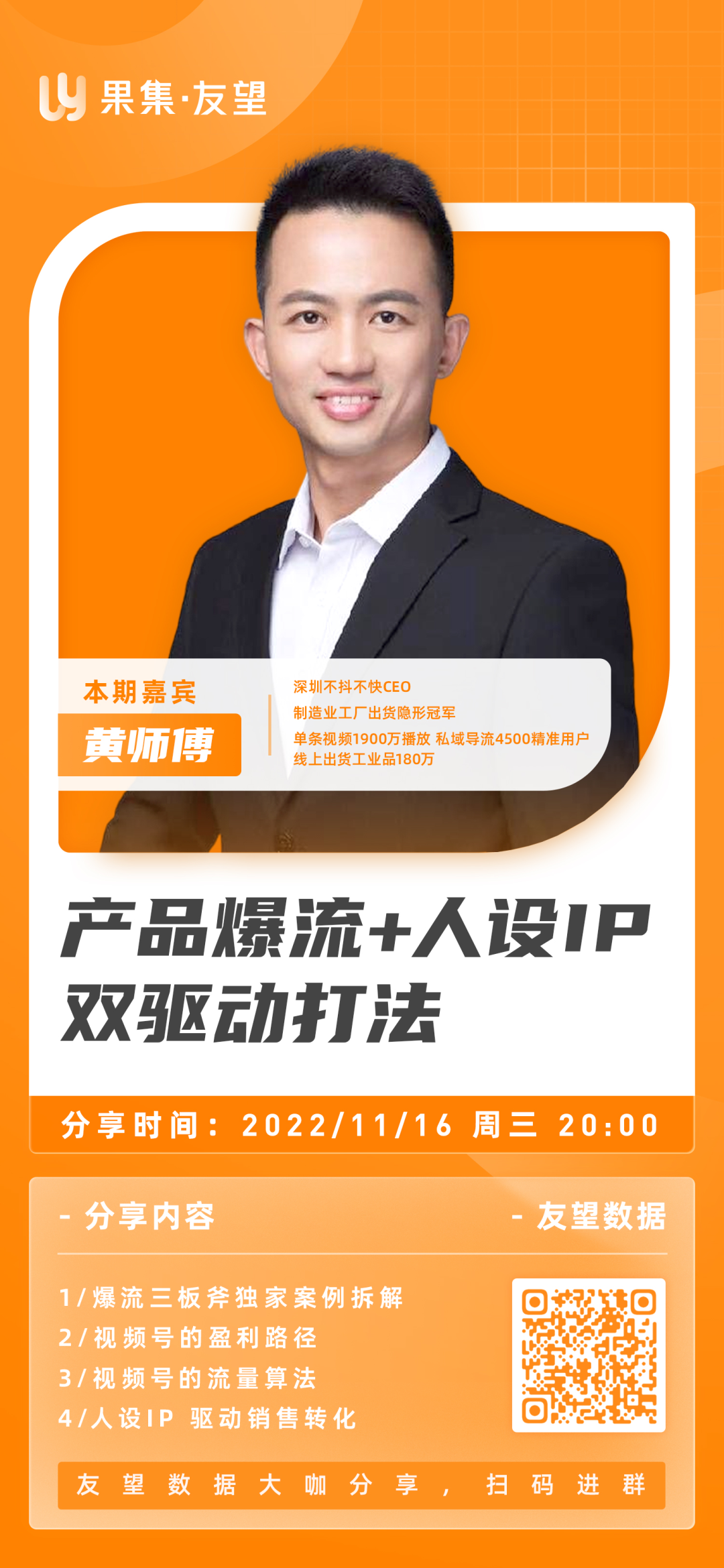 以友望数据直播宣传海报为例,简单介绍直播嘉宾信息,明确直播主题以及直播内容,再标注清楚直播的时间和二维码,做完之后可进行私域宣传。