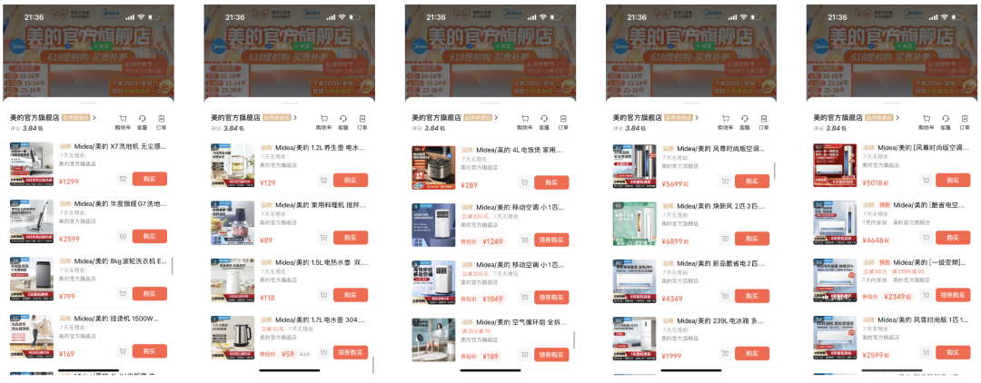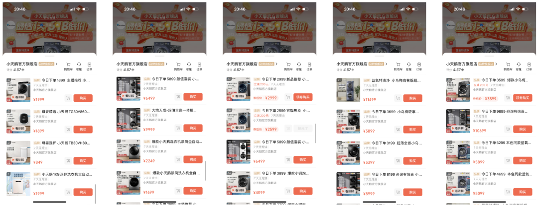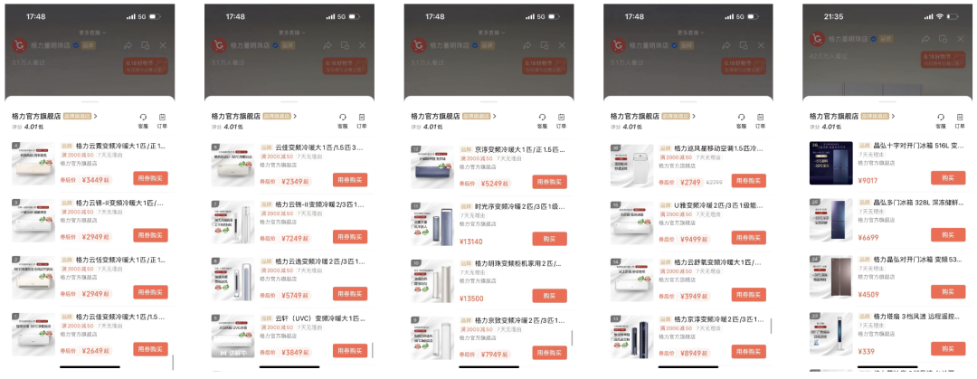 对比来看,在直播间购物货品的呈现上都各有亮点。格力、美的通过减扣券的设置,用户在下单时点击“用券购买”、“领券购买”按钮,增加了一份参与大促活动的优惠感;而小天鹅则通过在标题中增加“今日下单+价格”的文案,给用户一种限时提醒,促使尽快完成下单抉择。