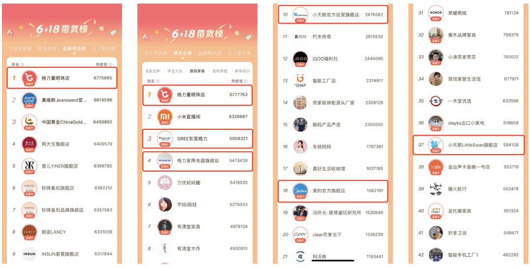 但有趣的是,今年视频号618品牌带货榜的 TOP1 王冠就稳稳地戴在了格力的头上,总销售额破 2500 万。另外同时上榜的小天鹅、美的等家电品牌也表现不俗。