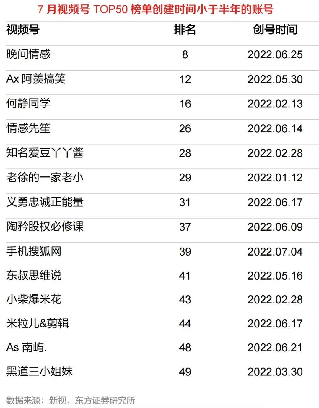 我们来看一组数据,根据第三方机构“新视”的数据,去年7月视频号TOP50的榜单中,有14个账号是半年内新创号的。