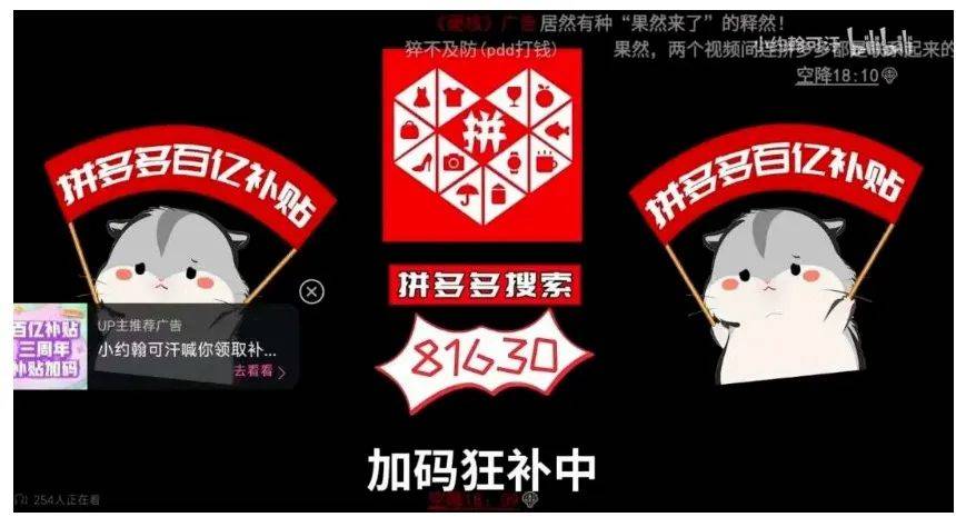 过去一年,拼多多被网友们戏称是“B站最大的金主”,“以一己之力养活了站内一半的UP主”。这是因为很多UP主的视频中经常穿插拼多多百亿补贴的定制、弹窗和蓝链广告,而且投放并没有针对特定的人群,无论是知识区、测评区、影视区等都有出现。