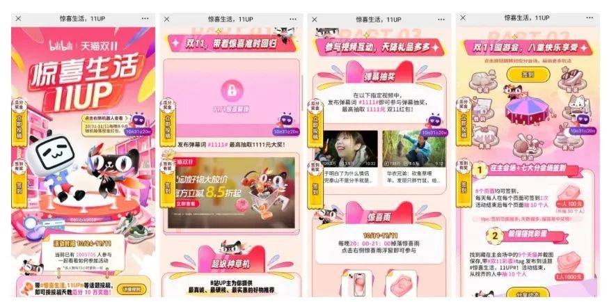 同时,B站还联合天猫上线了名为“惊喜生活,11UP”的大型整合营销活动。活动专题页内包含一个主会场和七大分会场,覆盖家居、3C数码、美妆个护、潮流服饰、萌宠、美食、运动七个重点品类,还面向UP主及用户发起投稿、签到、弹幕抽奖以及红包雨等活动。