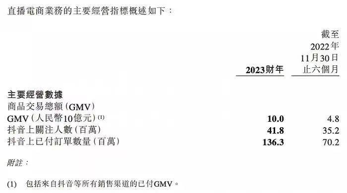 8月25日,东方甄选公布了从去年6月1日至今年5月31日的2023财年全年业绩。财报显示,在2023财年,东方甄选直播电商业务商品交易总额达到人民币100亿元,其中绝大部分来自抖音。2023财年,抖音上第三方产品及自营产品的已付订单总数为1.363亿单。
