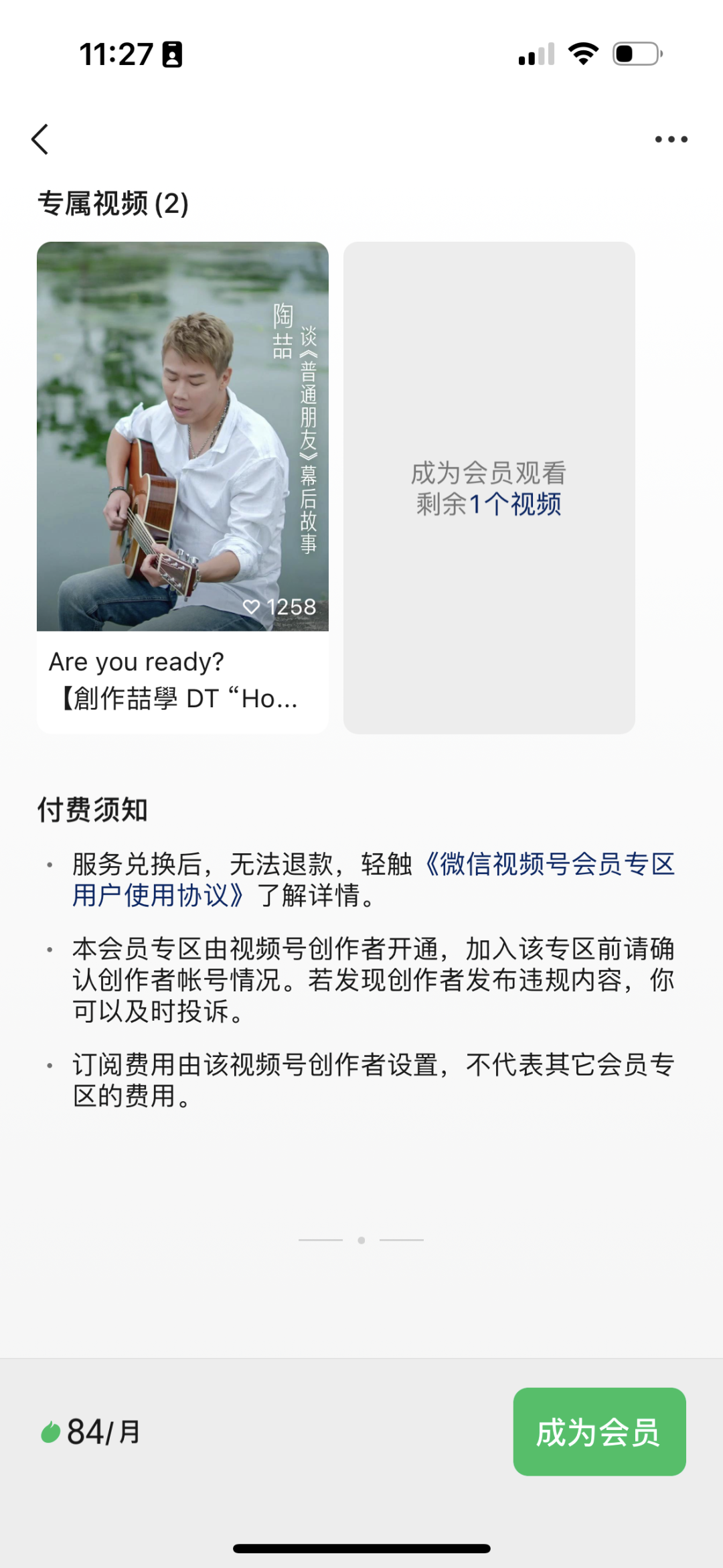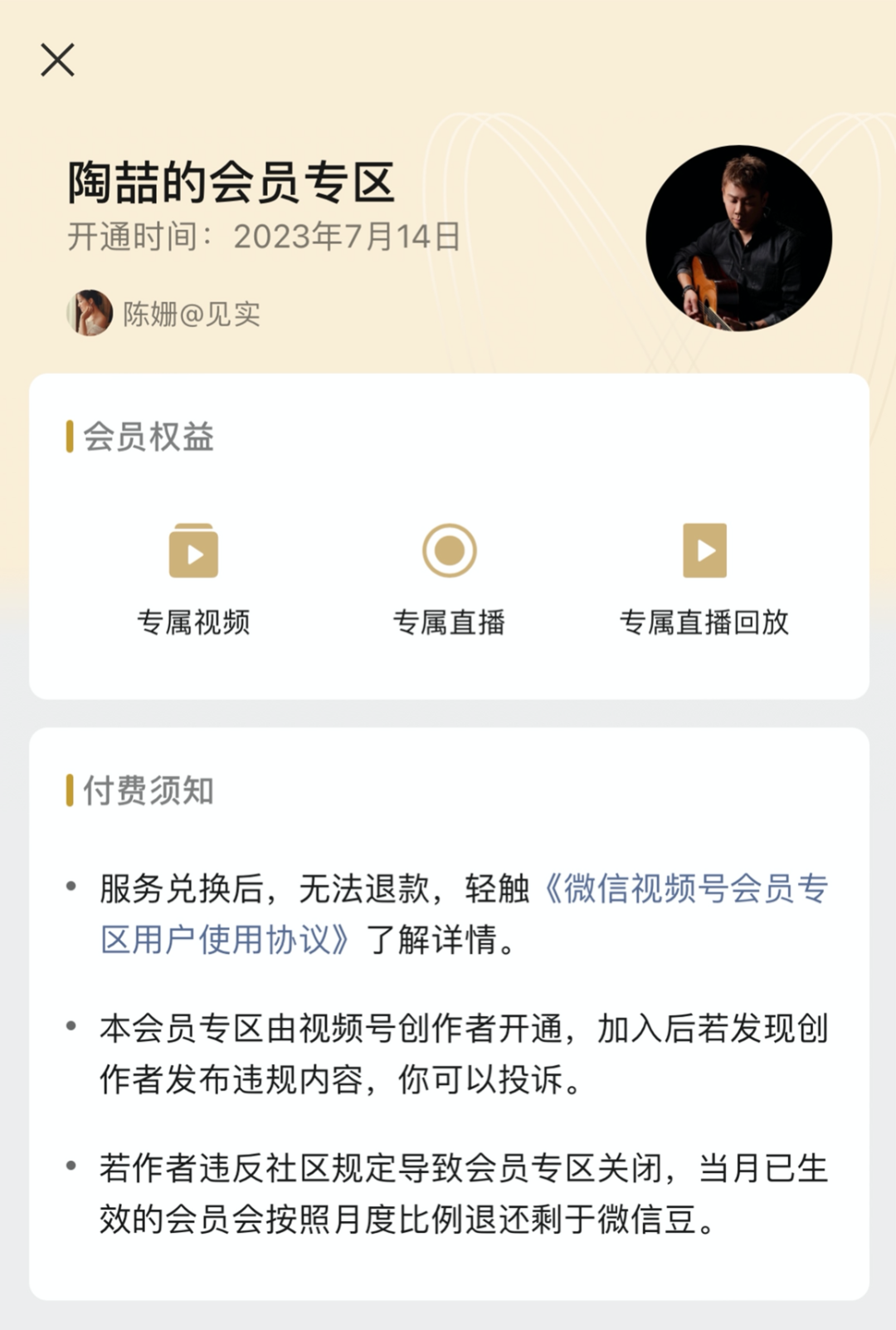 在昨晚陶喆的视频号中,我们看到该账号有了内测机会。在视频号首页可以清晰看到「成为会员」,点击后可以看到花费84个微信豆(安卓系统用户花8.4元,iOS系统用户花12元)就可以成为月度会员,观看会员专属视频,以及点赞和评论。