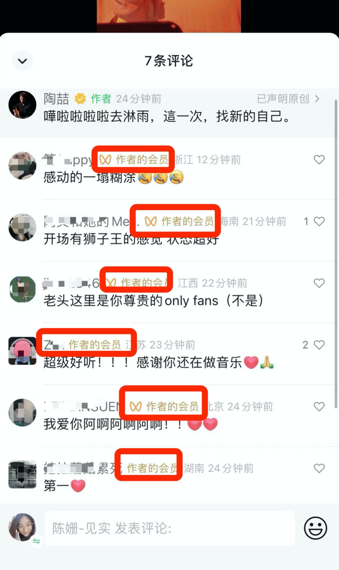 在账号播放回放期间,会员专区更新了几条新视频,为演唱会的剪辑视频,评论区的粉丝账号都会带有明显标识「作者的会员」。