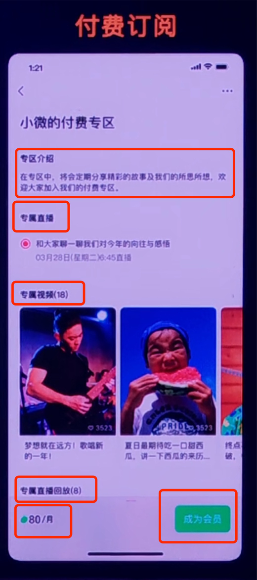 从当时的介绍截图来看,付费订阅功能可帮助创作者更好地服务付费会员,用户可以通过缴纳月费成为会员,获取创作者付费内容专区/专栏内的专属原创直播、视频、直播回放等。