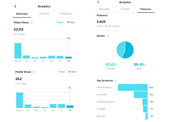设置好Pro账户后,回到“个人资料设置 (Privacy and settings)”就多了一个“分析(Analytics)”选项,首次开启功能需要等待7天才能生成足够的数据生成图表。TikTok Analytics将会提供多个维度供用户评估账号表现:包括:视频浏览量,简介浏览量,粉丝量,粉丝人群画像等等。