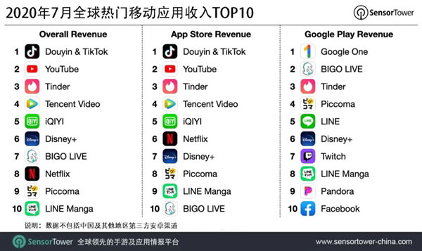 8月5日消息,Sensor Tower商店情报数据显示,2020年7月抖音及海外版TikTok在全球App Store和Google Play吸金超过1.02亿美元,是去年7月的8.6倍,再次蝉联全球移动应用(非游戏)收入榜冠军。