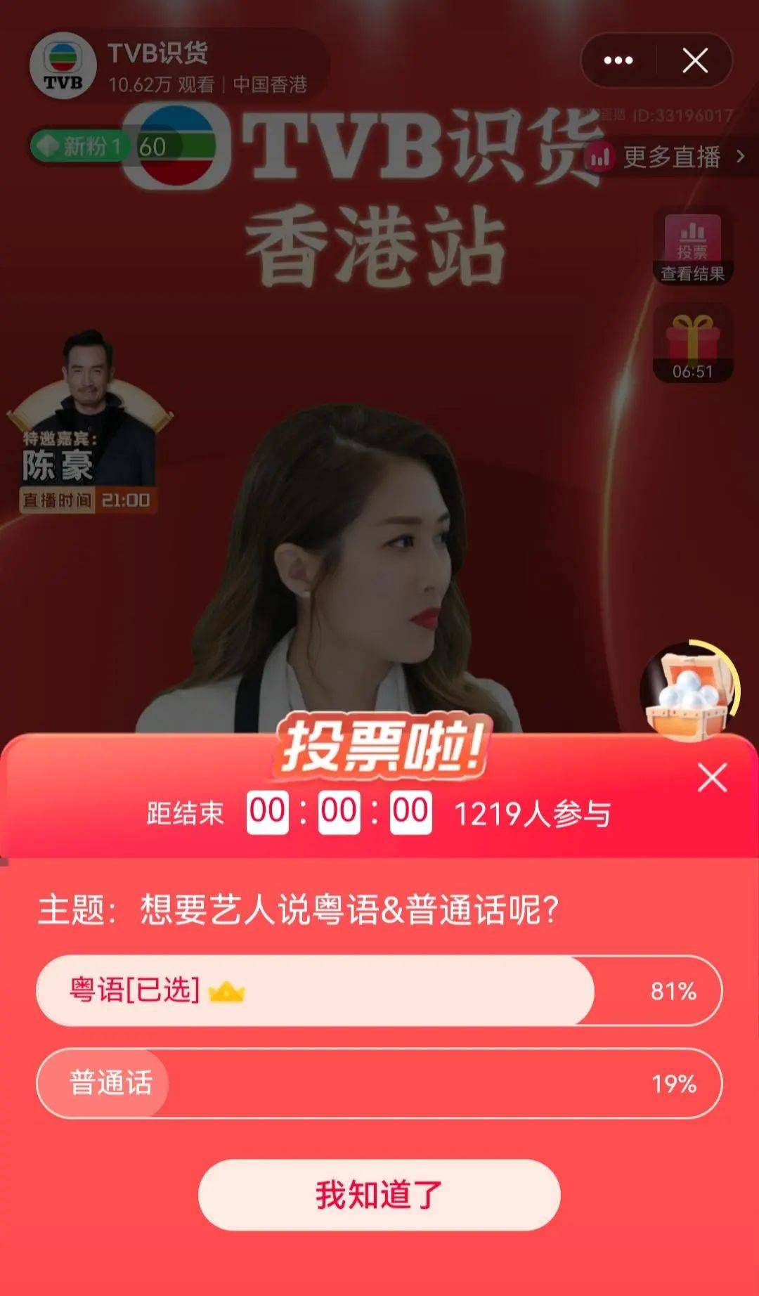 陈敏之和陈豪努力用普通话和观众沟通,但讲着讲着就换成了粤语,直播间也发起了投票“你希望艺人讲粤语还是普通话?”结果显而易见,被情怀牌吸引来的观众纷纷表示说粤语才正宗,只有19%观众希望听到普通话。