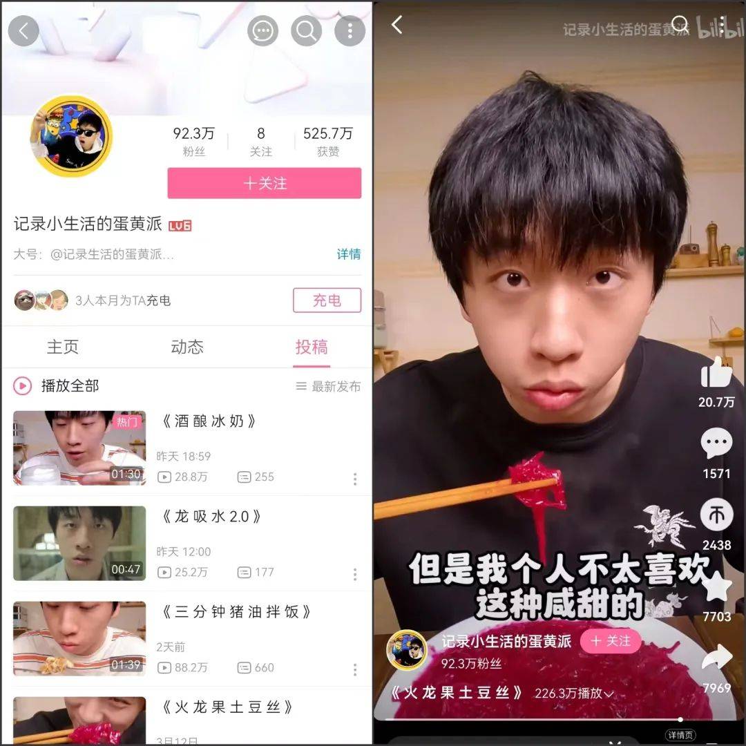 例如@记录生活的蛋黄派,账号主打美食制作,小号@记录小生活的蛋黄派则更加放飞,在内容方向、时长、拍摄方式上都与主账号大相径庭。其小号以竖屏视频为主,时长在半分钟至两分钟间不等,主打生活日常记录。对蛋黄派来说,主账号可能要花十天时间做一只烧鹅,但小号内容在拍摄间隙就能快速完成。而这些生活流视频并不适合放在主账号中展示,反而在小号中有助于帮其补充内容。目前,@记录小生活的蛋黄派粉丝量涨至91万。