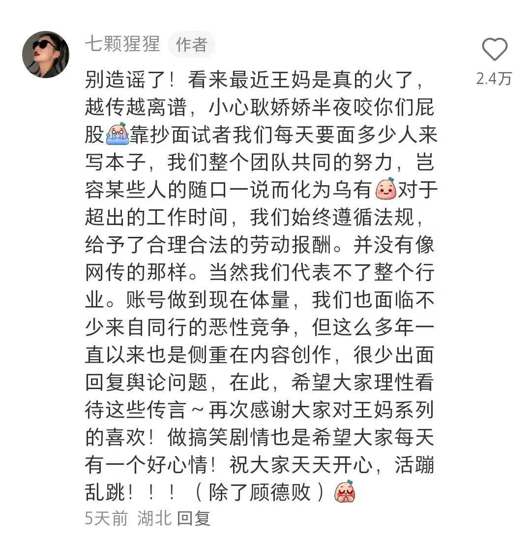 可能是王妈形象过于深入人心,所以当七颗猩猩“真霸总”的身份被扒出,其背后MCN荒野文化实行大小周、不给试用期员工交社保的情形被曝光,用户们“被背刺”的应激反应才如此剧烈。