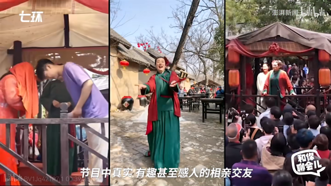 今年年初,在全国文旅热的催动下,不少网红博主前往武侠城打卡,其中包括@B太、@周大爷不服老,后者与王婆的互动为节目带来了第一波热度。此后,高颜值俊男美女频繁出现,加之王婆出色的演绎能力,令这档节目迅速爆火。