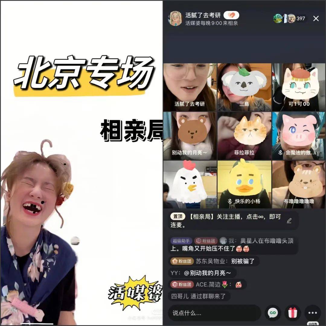 其中,短视频、直播的快速发展也催生出千千万万的“红娘”。比如,小红书博主@活腻了来相亲,原本是一名考研博主,考研结束后,她原来开设的背书直播渐渐转为相亲、整活直播间。博主自称“活媒婆”,每晚9点“非活勿扰”准时开播,嘉宾们以九宫格的形式直播连麦。