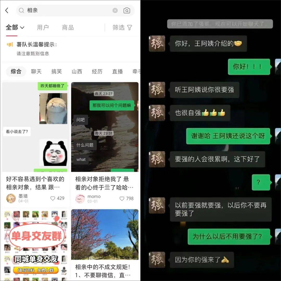 话题下,有人列出自己的相亲经历,逐一复盘、剖析利弊;有人晒出与奇葩相亲对象的聊天记录,造就了“你以后不用再要强,因为你的强来了”“云想衣裳花想容,美丽的牡丹花醒了吗”等热梗;还有博主以“相亲穿搭”“相亲建议”为内容,将自身包装成情感博主吸引流量。