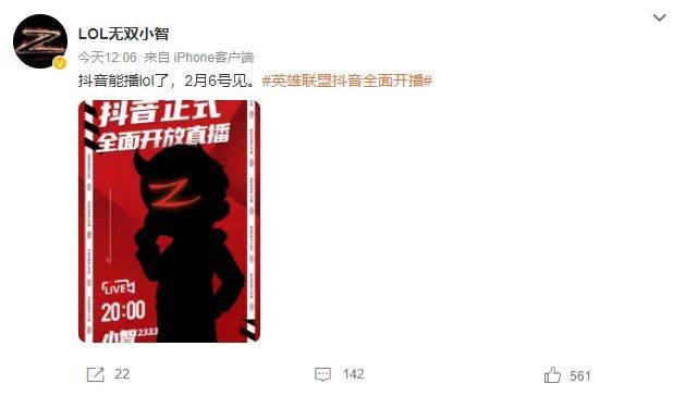 此消息公布后,在各大社交媒体引发轰动,#英雄联盟抖音全面开播#等相关词条迅速冲上微博热搜,游戏直播界的元老级人物“小智”也是在今日中午光速官宣,直言“抖音能播lol了,2月6号见”。